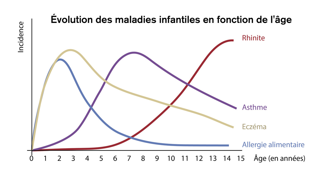 L’allergie est fréquente chez les enfants, adolescents et adultes. Dans le concept de la « marche atopique » (figure ), l’eczéma infantile et les allergies alimentaires précèdent l’apparition d’une maladie allergique des voies respiratoires (rhinite et asthme). Certaines manifestations peuvent cependant débuter à un âge plus tardif ou sans aucun autre signe d’atopie. La rémission et la rechute sont possibles à tout âge. Des données récentes sur l’évolution de l’allergie alimentaire chez l’enfant montrent un taux de résolution élevé dans l’enfance pour certains aliments : le lait (> 50 % entre 5 et 10 ans), l’œuf (environ 50 % entre 2 et 9 ans), le blé (50 % à l’âge de 7 ans) et le soja (45 % à l’âge de 6 ans). En revanche, d’autres persistent, et une résolution est peu probable, comme pour l’allergie à l’arachide ou aux fruits à coque. Certaines allergies (graines, poisson, crustacés) sont, elles, toujours considérées comme persistantes.