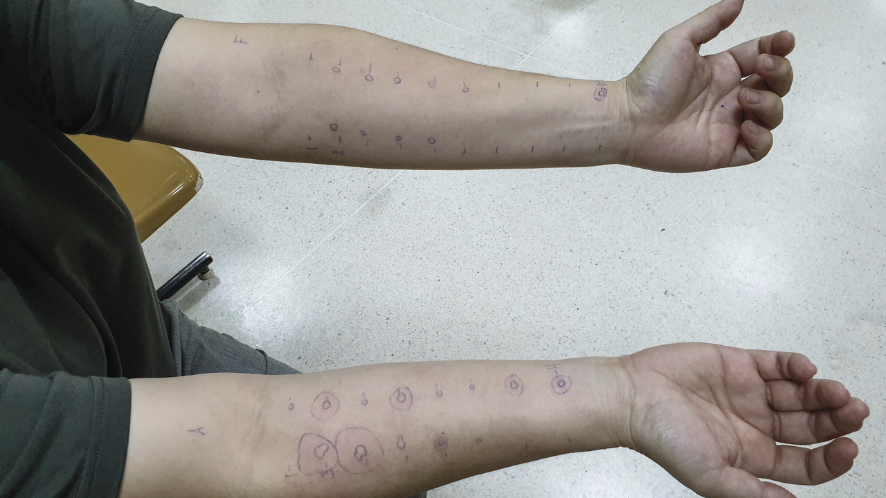– les tests cutanés (pricks) avec des extraits standardisés ou, plus souvent, avec l’aliment natif. Un test négatif exclut généralement une allergie ;