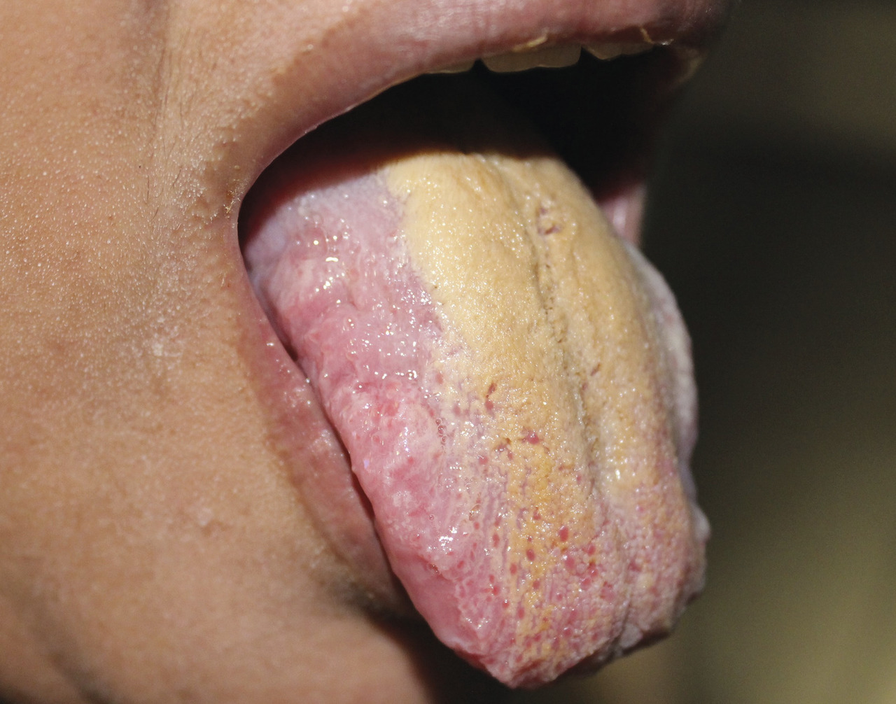 Mégane, 35 ans, SDF, consulte car elle est asthénique et dyspeptique depuis quelques mois. De plus, elle a un enduit de couleur brune sur la langue, résistant aux antifongiques.