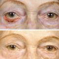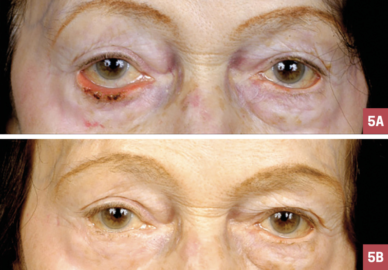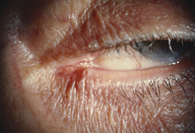 – à un stade plus avancé : sténose de la voie lacrymale et rétraction cutanée (le patient ne se plaint plus de larmoiement mais de l’aspect très inesthétique de sa paupière).