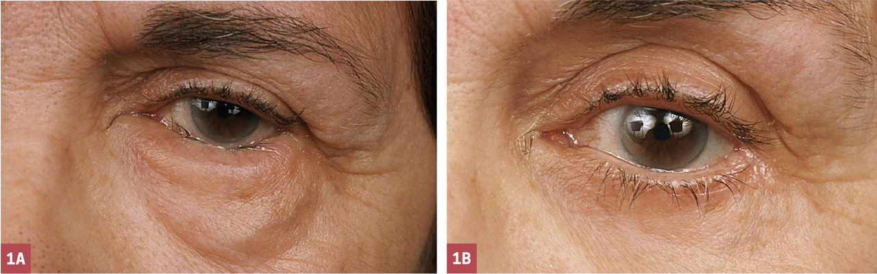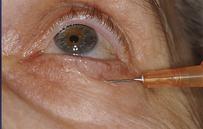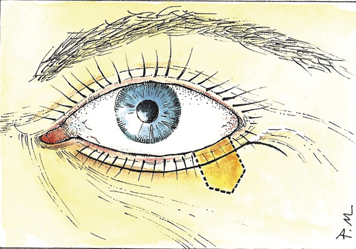 – toxine botulique A : si contre-indication temporaire ou définitive à la chirurgie (mauvais état général, patient sous anticoagulants) ; 3-4 injections réparties en sous-cutané sur toute la paupière inférieure (fig. 4) ; l’effet dure environ 3 à 6 mois ; ensuite : chirurgie ou répétition des injections ;