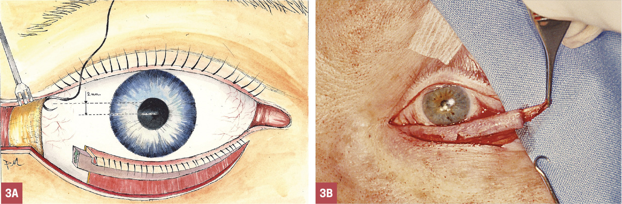 – raccourcissement de la paupière inférieure dans sa portion externe soit par une résection pentagonale (on enlève quelques millimètres au tiers externe du bord libre pour retendre la sangle,fig. 2 ) soit par canthopexie externe (remise en tension à l’extrémité latérale après désolidarisation de la paupière de son attache au périoste orbitaire, puis refixation, fig. 3 ) ;