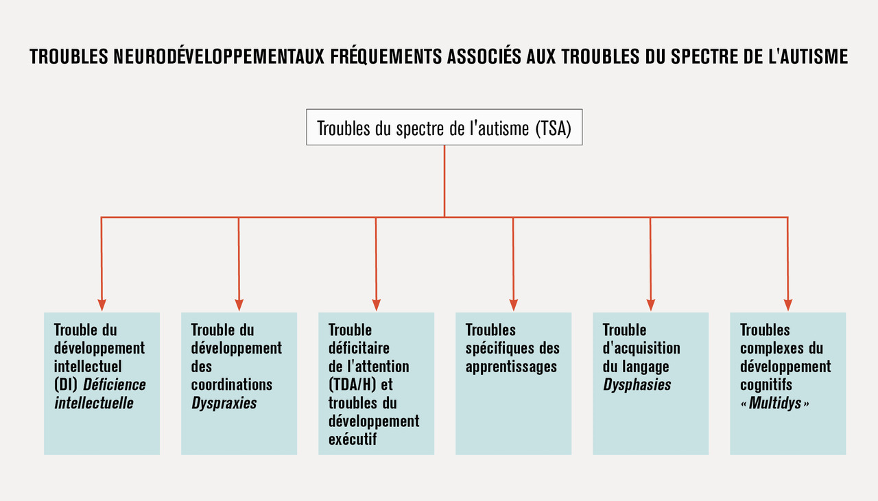 – ensuite, au moment du diagnostic, l’équipe pluridis- ciplinaire dite de 2e ligne se charge de préciser le diagnostic d’autisme et d’identifier de manière formelle les fréquentes comorbidités. En effet, l’autisme est très souvent associé aux autres troubles du neurodéveloppement : dans 40 à 70 % des cas au trouble déficitaire de l’attention, dans 30 à 50 % des cas à une déficience intellectuelle. Dans 20 % des cas, l’autisme est associé à l’épilepsie. Ces constats (fig. 3) mèneront à établir un programme de soins et d’accompagnement et un suivi coordonné spécifiquement adapté.12