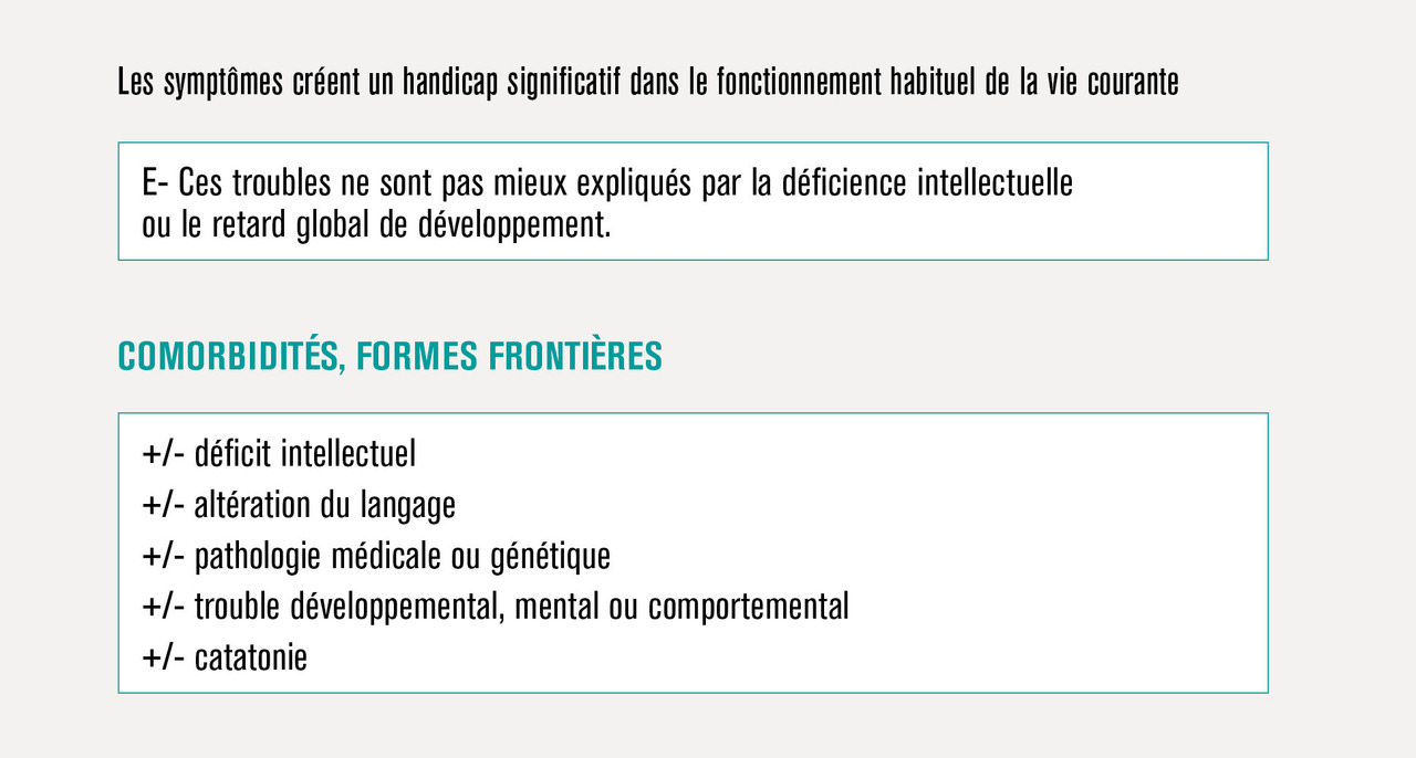 Pour tenir compte de la grande diversité des situations cliniques et des évolutions différentielles possibles, des critères complémentaires ont été introduits : ils précisent d’une part le degré de sévérité de l’autisme selon trois niveaux d’aide requise, et d’autre part les comorbidités et facteurs aggravants : déficience intellectuelle, altération du langage, pathologie médicale ou génétique connue, facteurs environnementaux (fig. 1B).