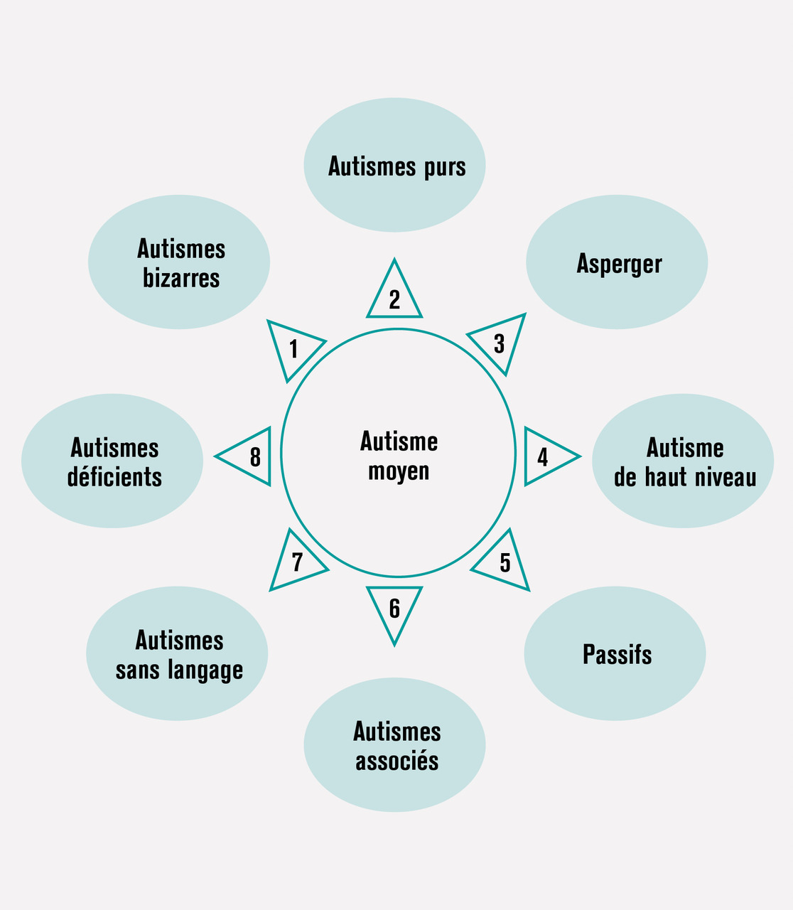 Ainsi la notion d’autisme s’est élargie et nuancée pour en arriver à la notion d’un « spectre de l’autisme » qui est à l’origine de ce que les Anglo-Saxons ont appelé « autism spectrum disorder », en français « trouble du spectre de l’autisme », vie entière (fig. 2).