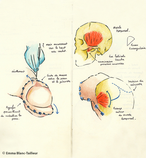 Je travaille au bloc opératoire, en illustrant les étapes importantes d’une opération, de l’incision – voire dès l’anesthésie – jusqu’à la fin de la procédure. Cela concerne en particulier des chirurgies complexes neurologiques et maxillofaciales en pédiatrie, notamment des opérations rares – certaines chirurgies pour corriger des malformations crâniofaciales, par exemple –, de développement récent, pour lesquelles il n’existe actuellement pas d’images descriptives. Or ces images sont nécessaires pour l’enseignement, pour expliquer aux internes par la suite, etc. : mon travail consiste donc à les produire !