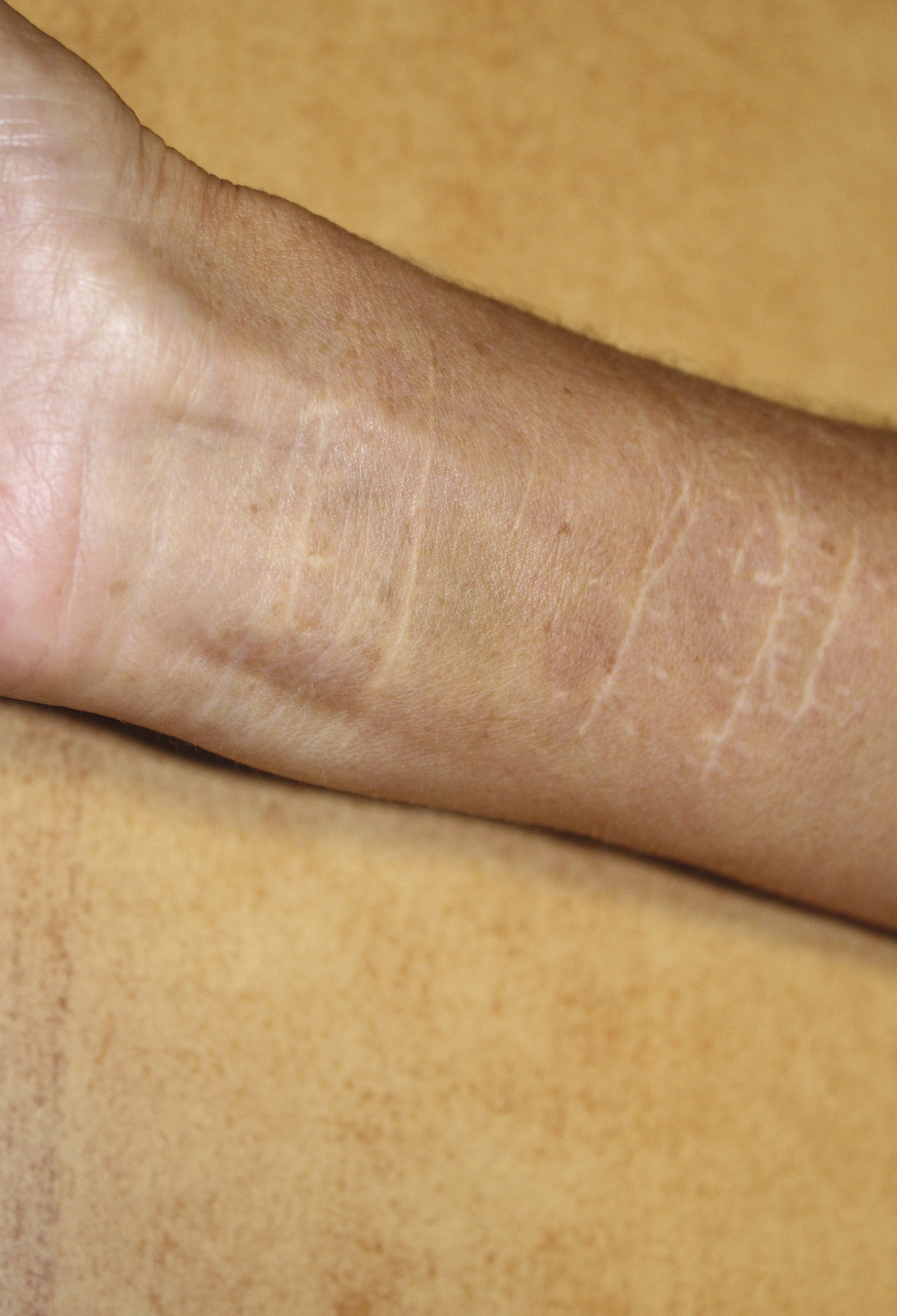 L’examen met en évidence des scarifications au niveau de l’avant-bras droit (