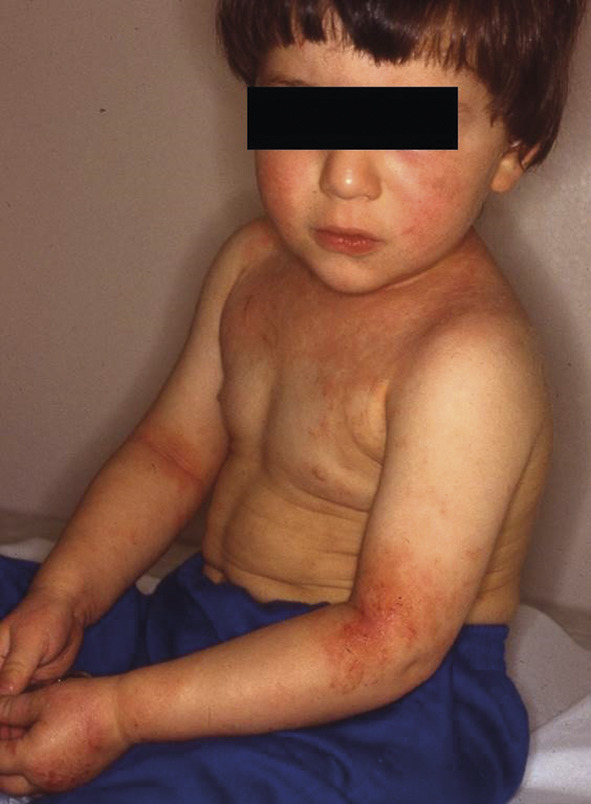 C’est l’eczéma constitutionnel/endogène ayant pour origine des facteurs génétiques et environnementaux. Il débute chez le bébé ou l’enfant et disparaît habituellement vers l’adolescence. Le tableau clinique est stéréotypé (fig. 1) mais variable selon les âges. Les patients ont également tendance à développer d’autres symptômes (rhinite, conjonctivite, sinusite ou asthme) et des allergies.