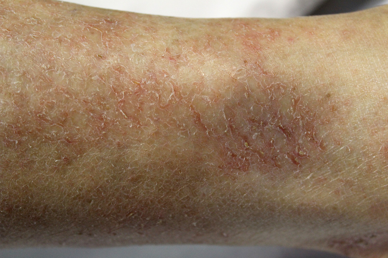 De diagnostic évident, il s’agit d’un eczéma des jambes associé à une insuffisance veineuse manifeste. Le traitement est celui de l’insuffisance veineuse des membres inférieurs.