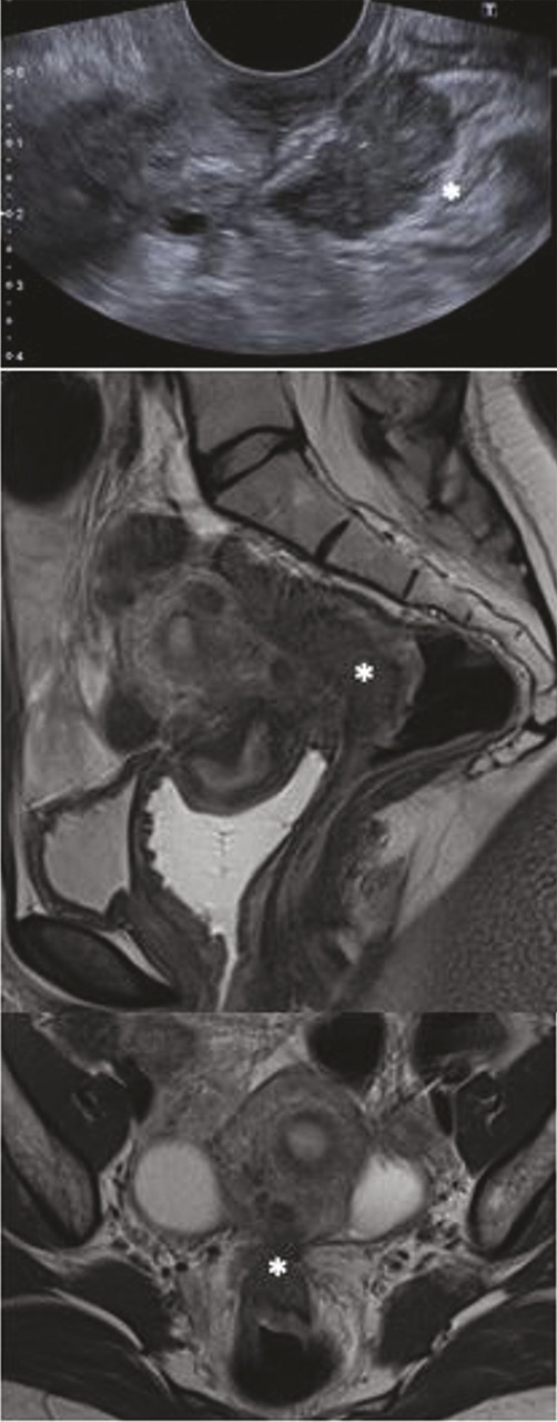 Réaliser plusieurs examens complémentaires augmente de façon importante la sensibilité diagnostique. En effet, selon une étude qui a porté sur 407 patientes,14 associer l’IRM et l’écho-endoscopie rectale pour poser le diagnostic d’endométriose colorectale augmentait la sensibilité de détection de 10 %, et le diagnostic était confirmé en peropératoire dans 100 % des cas lorsque les deux examens étaient concordants (figure ).15