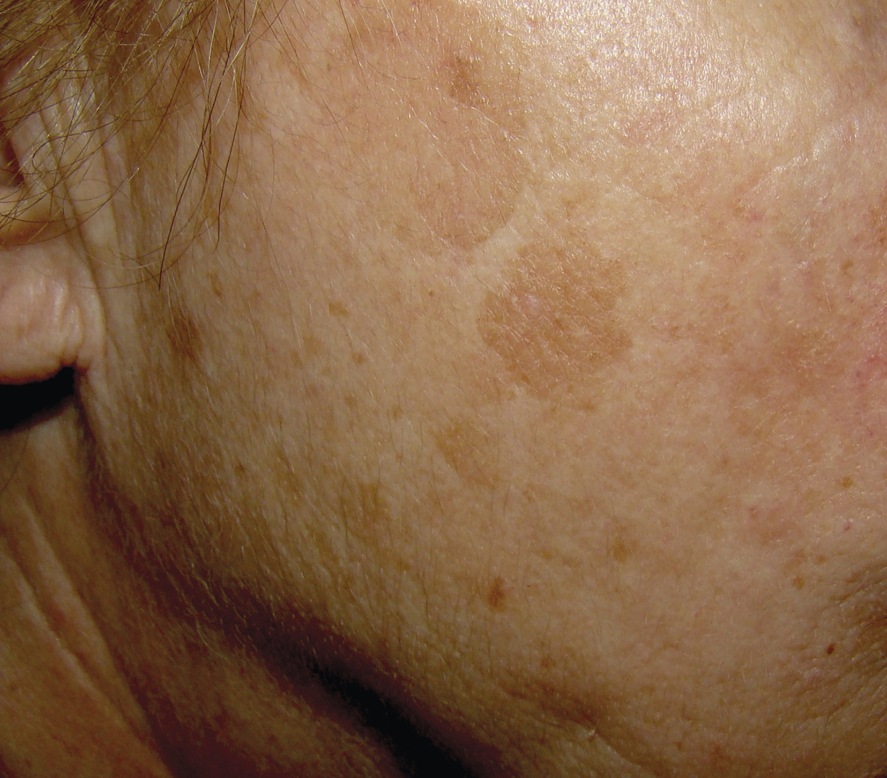 Martine, 72 ans, ancienne viticultrice, est très inquiète car elle a de multiples placards pigmentés de couleur brun clair au niveau des joues.