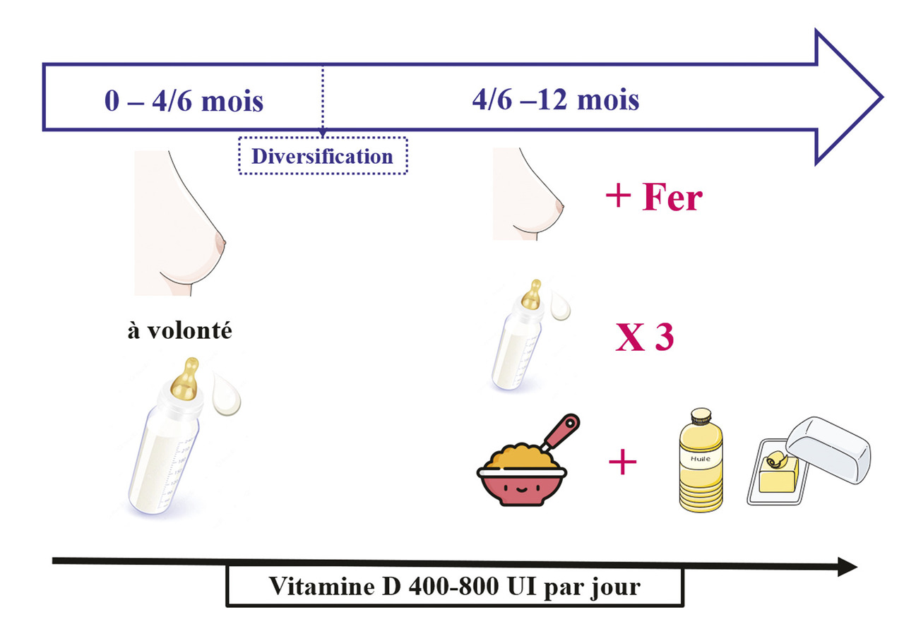 Les recommandations pratiques permettant d’assurer les apports indispensables au bon développement d’un nourrisson peuvent se résumer ainsi (figure ) :