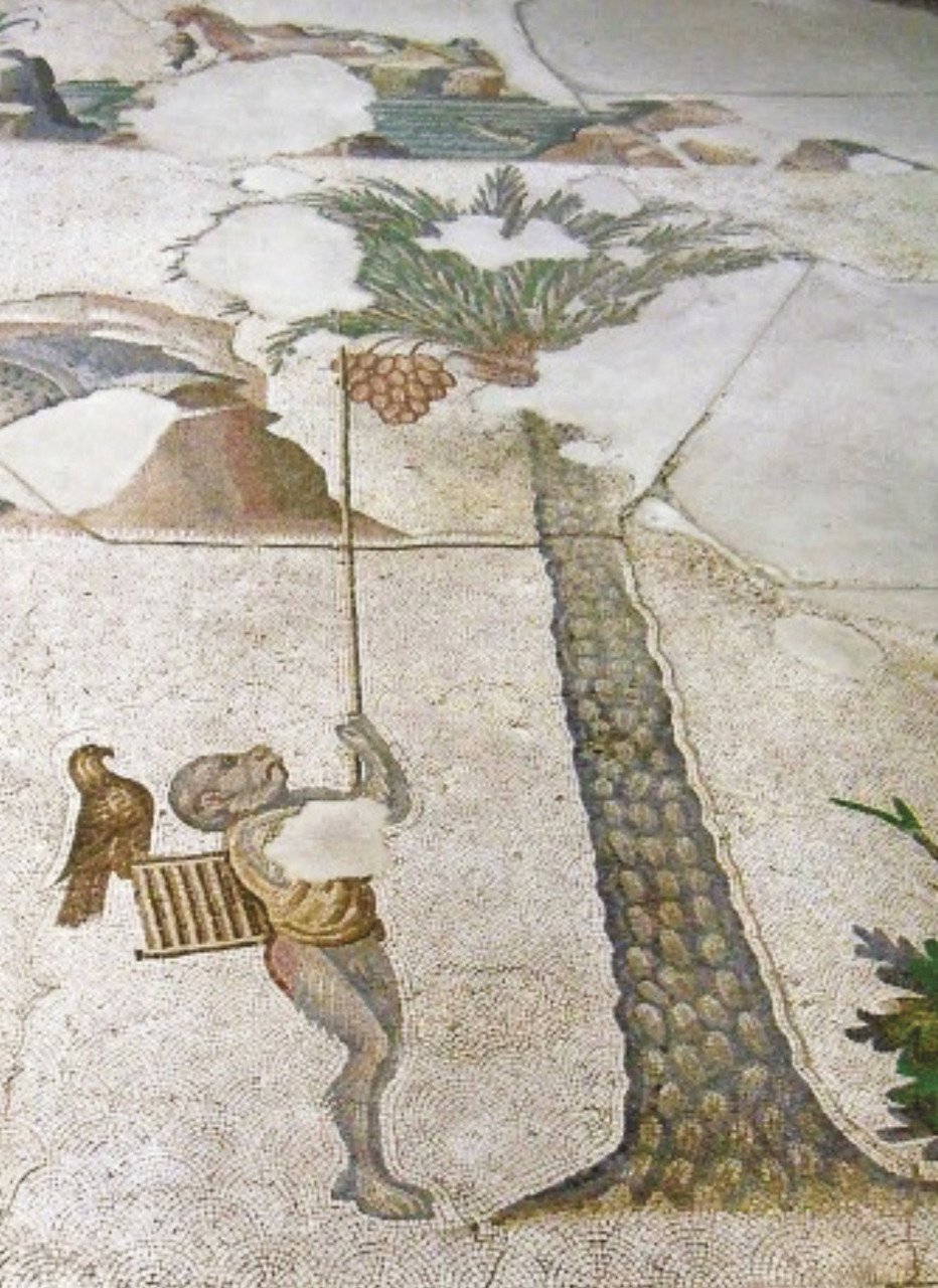 Figure 3. Un singe, avec une perche, essaye de faire tomber des dattes d’un palmier (mosaïque romaine) .