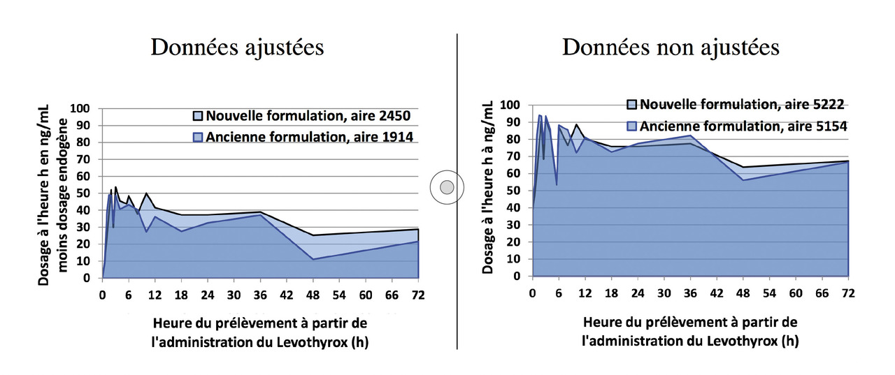 Coste et al. contestent la nécessité de soustraire la valeur de la lévothyroxine endogène observée chez chaque sujet avant l’administration du médicament (moyenne des trois valeurs observées une demi-heure avant, un quart d’heure avant et au moment de la prise du médicament) pour étudier la biodisponibilité des deux formulations de lévothyroxine exogène administrées à H0, l’étude allant jusqu’à H72. La