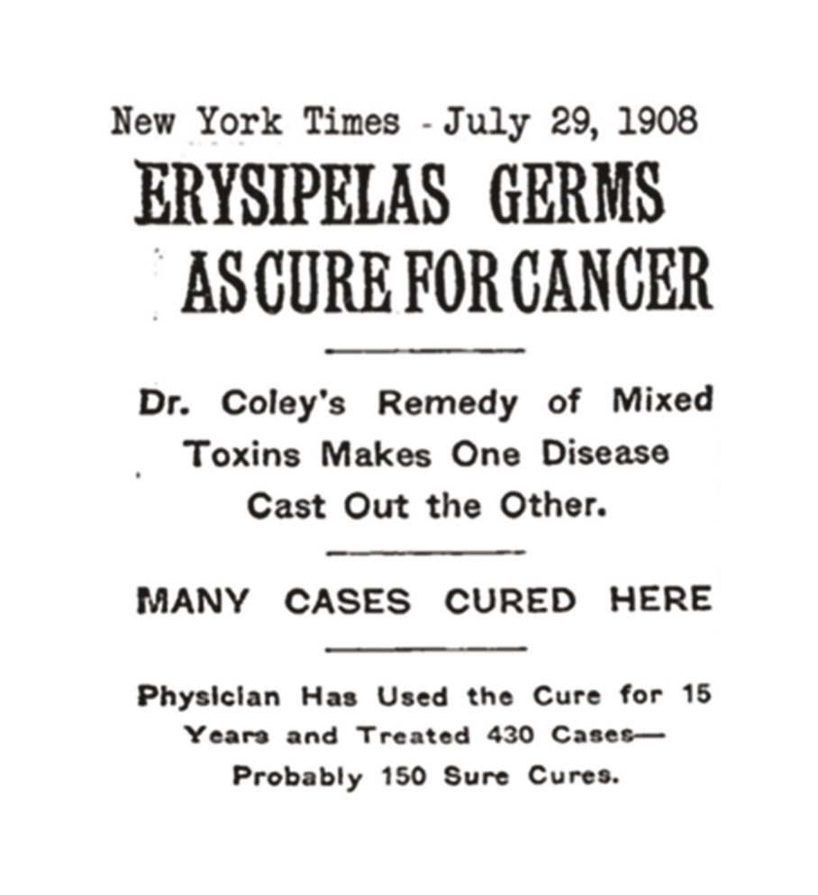 Mais l’idée d’un lien entre cancers et microbes n’est pas abandonnée pour autant. Car on n’a pas oublié les résultats troublants de William Coley, ce chirurgien new-yorkais qui, après avoir observé la régression d’un ostéosarcome chez un patient atteint d’érysipèle, entreprend de traiter ses patients porteurs de tumeurs similaires par l’injection de streptocoques vivants.2 Les effets sur le cancer sont encourageants (