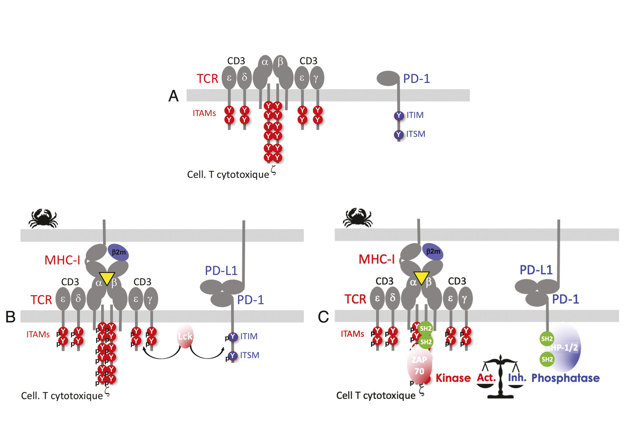 CTLA4 et PD-1 ne fonctionnent pas de la même façon. On connaît moins bien les mécanismes moléculaires utilisés par CTLA4 pour inhiber l’activation des cellules T que ceux qu’utilise PD-1. PD-1 possède dans son domaine intracytoplasmique deux motifs d’inhibition dont un appartient à la famille des immunoreceptor tyrosine-based inhibition motifs (ITIM). L’engagement de récepteurs à ITIM avec des récepteurs activateurs induit la phosphorylation des ITIM par des tyrosine-kinases de la famille Src. L’ITIM ainsi phosphorylé permet le recrutement de phosphatases qui déphosphorylent des molécules de signalisation et arrêtent ainsi l’activation cellulaire (