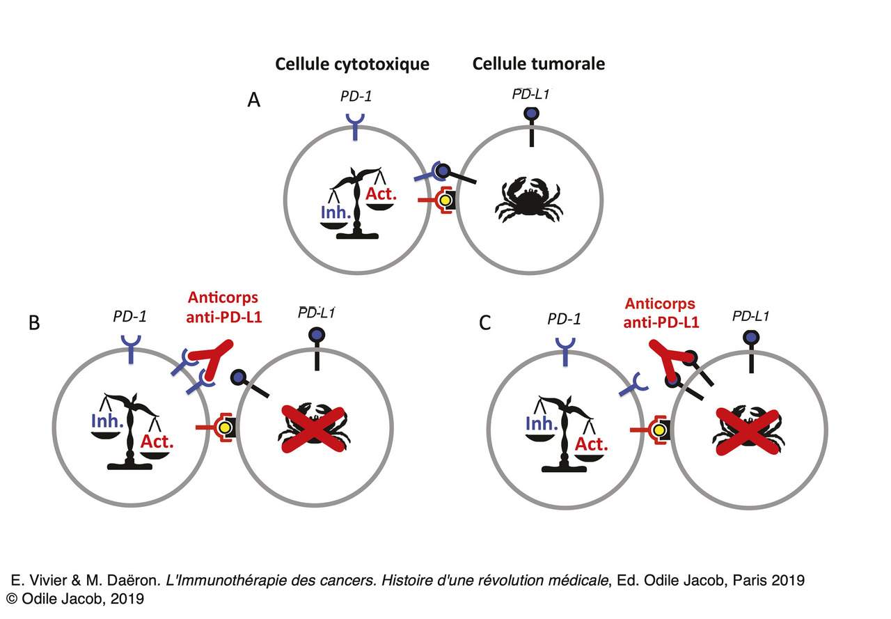 Au début des années 1990, on se rend compte qu’à côté de ces récepteurs activateurs, il existe des récepteurs inhibiteurs. L’engagement simultané des deux types de récepteurs sur une même cellule engendre un mélange de signaux d’activation et de signaux d’inhibition dont l’intégration détermine l’intensité de la réponse cellulaire. De même qu’un mouvement peut être contrôlé avec une extrême précision par la contraction de muscles fléchisseurs et de muscles extenseurs, l’activation des cellules immunitaires est étroitement contrôlée par des mécanismes antagonistes.8 Elle l’est si bien qu’Allison et Honjo se demandent si les récepteurs inhibiteurs n’empêchent pas les cellules immunitaires de détruire les cellules cancéreuses, et donc de protéger contre le cancer.