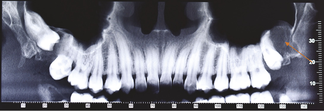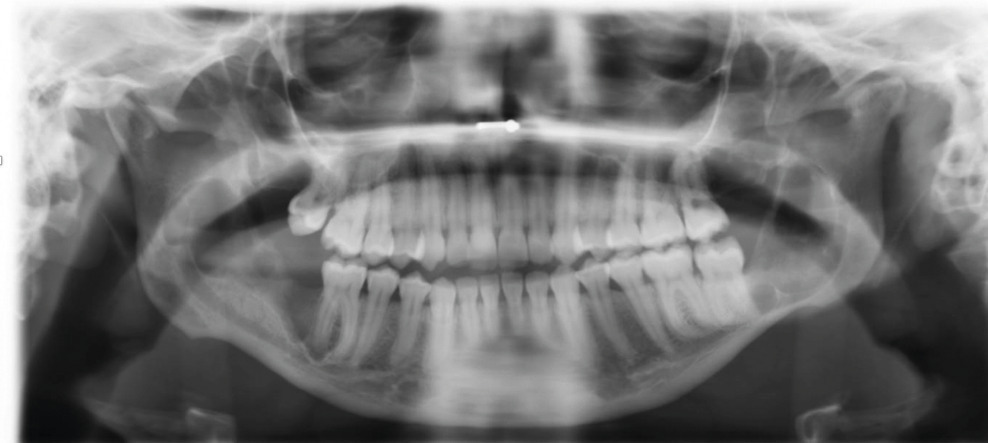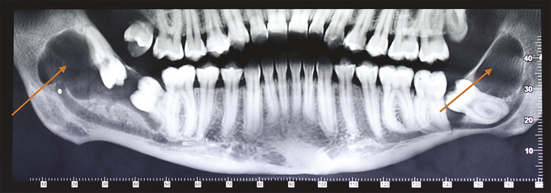 La présence simultanée de kératokystes doit faire suspecter un syndrome de Gorlin, ou nævomatose basocellulaire, maladie héréditaire transmise sur le mode autosomique dominante. Des mutations du gène PTCH1 sont responsables de ce syndrome. La pénétrance est complète mais l’expressivité variable.1 La prévalence estimée varie de 1 sur 57 000 à 1 sur 164 000. L’espérance de vie des patients atteints par ce syndrome n’est pas diminuée. La prise en charge doit être multidisciplinaire. La recherche d’un carcinome baso-cellulaire est essentielle, et l’exposition excessive aux ultraviolets est déconseillée. Les études rapportent2 par ordre d’apparition : une fibrose cardiaque chez le nouveau-né, des médulloblastomes chez le jeune enfant, les kératokystes odontogènes chez le jeune adulte et enfin les tumeurs ovariennes chez la femme en âge de procréer.