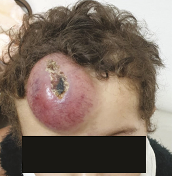 À l’examen clinique, la lésion est angiomateuse frontale, dure à la palpation, indolore, mesurant 8 cm de grand axe, sans autres signes (