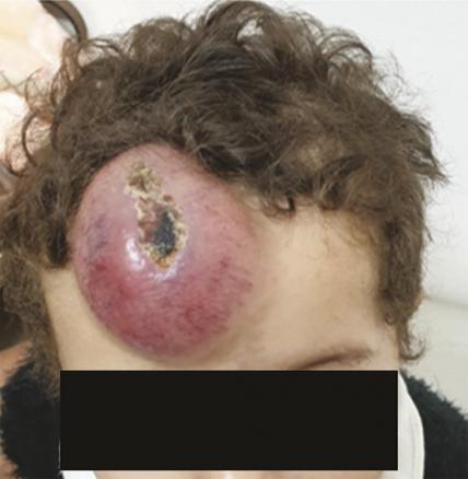 Un nourrisson de sexe féminin consulte pour la première fois à l’âge de 9 mois dans notre service pour une lésion évoluant depuis l’âge de 2 mois. Troisième enfant d’un couple sans antécédents notables, née à terme d’une grossesse sans complications, cette petite fille était à jour de ses vaccinations avec un développement normal.