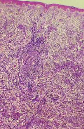 Après concertation pluridisciplinaire, dermatologues et chirurgiens décident d’une biopsie-exérèse. L’étude histologique révèle une infiltration blastique massive (