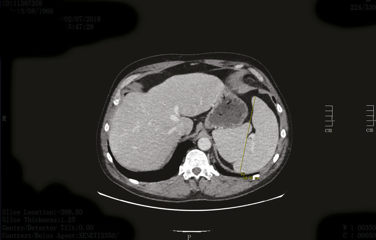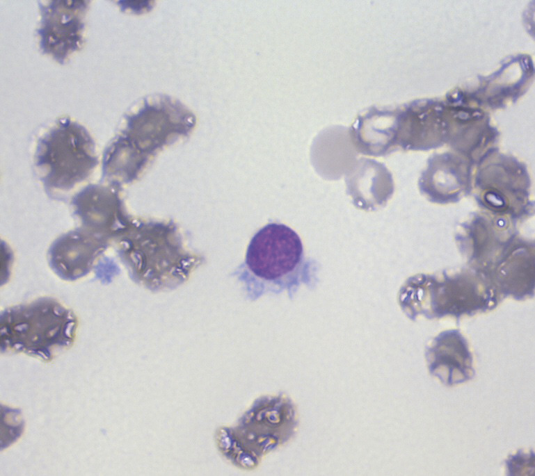 Cet homme de 52 ans, sans antécédent notable, était hospitalisé pour une pneumopathie. Le bilan biologique montrait, outre un syndrome inflammatoire biologique, une pancytopénie prédominant sur la lignée blanche avec une neutropénie à 1 000/mm3, une lymphopénie à 500/mm3 et une monocytopénie entre 0 et 10/mm3. L’évolution de la pneumopathie était favorable sous antibiothérapie. Devant la persistance des cytopénies à distance de l’épisode septique et la présence d’une importante splénomégalie (fig. 1), une relecture attentive du frottis sanguin notait la présence de rares lymphocytes d’aspect « chevelu » (fig. 2). L’immunophénotypage sur sang confirmait le diagnostic de leucémie à tricholeucocytes et un traitement par pentostatine était prescrit (8 cycles de 4 mg/m2).