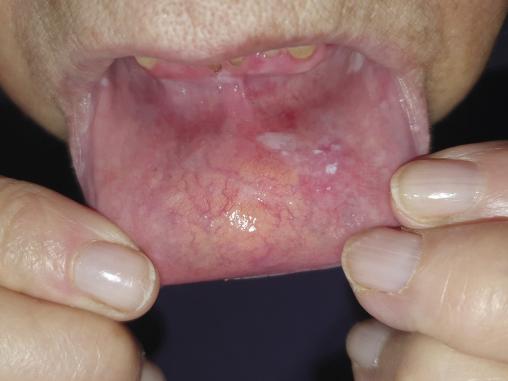 Hélène, 71 ans, consulte pour des douleurs gingivales (sensation de cuisson). Des placards de couleur blanchâtre sont mis en évidence sur la muqueuse labiale (photo ).