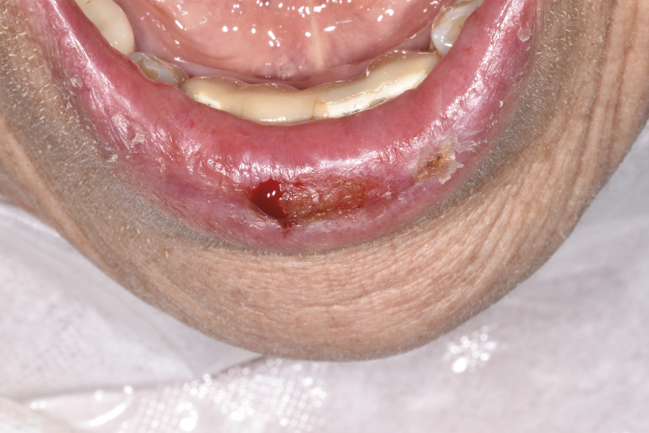 Une patiente de 86 ans consulte pour une lésion érosive douloureuse de la lèvre inférieure saignant au contact et présente depuis plusieurs mois (figure ). Dans ses antécédents, on note un asthme et une allergie au pollen pour laquelle elle est traitée quotidiennement par antihistaminiques. Elle ne fume pas.