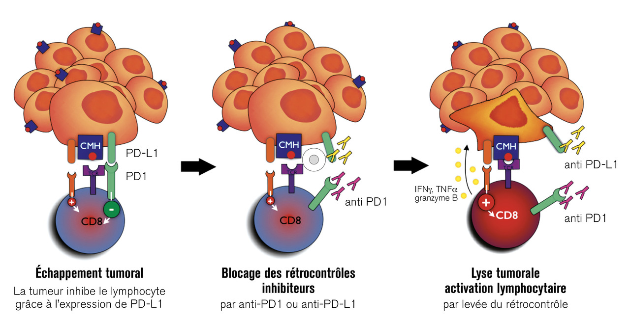 Cela a conduit à l’utilisation chez l’homme d’anticorps monoclonaux bloquant cette liaison PD-1-PD-L1 dans de nombreux cancers comme le mélanome, le cancer du poumon non à petites cellules, le cancer de la vessie, le cancer du rein, les cancers digestifs, les cancers de la sphère oto-rhino-laryngée, certains lymphomes...15 Parmi les dizaines d’anticorps en développement, certains ont déjà été reconnus par la FDA, deux anti-PD-1 (pembrolizumab et nivolumab) et un anti-PD-L1 (atézolimumab).
