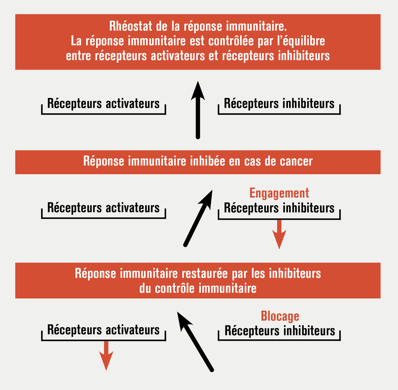 La production des anticorps monoclonaux, dont la découverte a valu à Kohler et Milstein l’attribution du prix Nobel de médecine en 1984, a permis de disséquer les antigènes membranaires des lymphocytes T et de mieux comprendre la physiologie de ces cellules. La principale molécule de costimulation des lymphocytes T, CD28, interagit avec les molécules B7, B7-1 (CD80) et B7-2 (CD86) des cellules présentatrices d’antigène pour induire l’activation, la prolifération et la survie des lymphocytes T.6 Très rapidement, il s’est avéré que ce rhéostat était plus complexe et comportait l’implication de récepteurs activateurs des lymphocytes T permettant d’amplifier la réponse immunitaire pour éliminer rapidement un pathogène (CD28, 4-1BB, ICOS...) et de récepteurs inhibiteurs (CTLA-4 [cytotoxic T lymphocyte associated proteine-4], PD-1 [programmed cell death-1]) pour la contrôler une fois le pathogène éliminé. C’est de cet équilibre subtil entre récepteurs activateurs et récepteurs inhibiteurs que dépend toute réponse immunitaire.