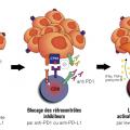 Même si les mécanismes d’action des anti-CTLA-4 et des anti-PD-1/PD-L1 font encore l’objet de nombreux travaux, il apparaît qu’ils sont différents. L’expression des molécules B7 sur les cellules présentatrices de l’antigène (cellules dendritiques) et non sur les cellules tumorales suggère que l’action des anti-CTLA-4 a lieu au niveau des organes lymphoïdes secondaires plus qu’au niveau des tumeurs. De plus, l’expression de CTLA-4 est plus importante au niveau des lymphocytes T CD4+ que des lymphocytes T CD8. Dans la mesure où CTLA-4 est fortement exprimé sur les lymphocytes T régulateurs, une déplétion de ces cellules au niveau des sites tumoraux pourrait rendre compte de l’efficacité des anticorps anti-CTLA-4. Cela semble vrai dans les modèles murins mais n’a pas été observé avec l’ipilimumab, ce qui pourrait justifier des modifications de son fragment Fc pour induire une cytotoxicité par antibody-dependant cellular cytotoxicity (ADCC). En raison de l’expression plus ubiquitaire des PD-L1, et en particulier au niveau des cellules tumorales, les anti-PD-1/PD-L1 semblent avoir une action plus périphérique, au niveau du micro-environnement tumoral, ce récepteur inhibiteur intervenant physiologiquement comme un inducteur de signaux « véto » anti-autoréactifs.