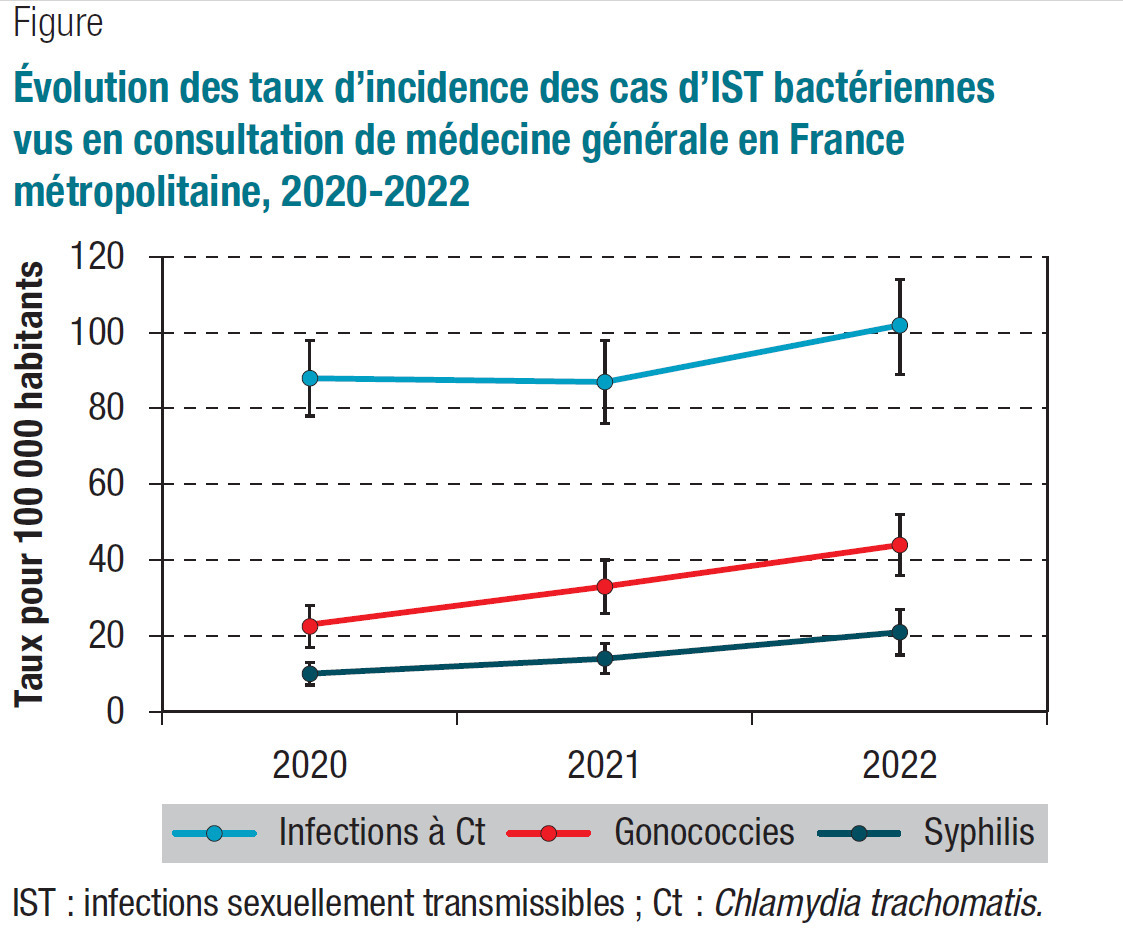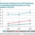 Une tendance à l’augmentation du taux d’incidence des IST bactériennes est observée en médecine générale depuis 2020. Ces hausses restent toutefois difficiles à analyser en l’absence de données comparables antérieures à 2020. Par ailleurs, ces taux sous-estiment probablement l’incidence réelle car ils sont calculés uniquement pour les cas confirmés biologiquement et pris en charge.