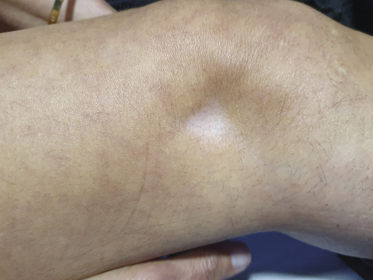 Myriam, 52 ans, a une gonarthrose bilatérale. Elle consulte, inquiète, car depuis quelques semaines elle a noté l’apparition d’une dépression hypopigmentée après une infiltration de corticoïdes dans cette zone trois mois auparavant (photo ).