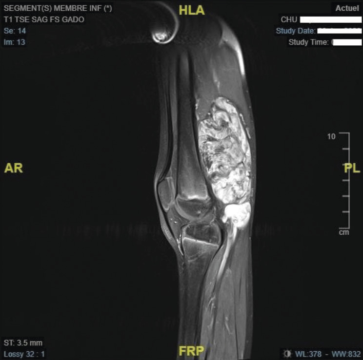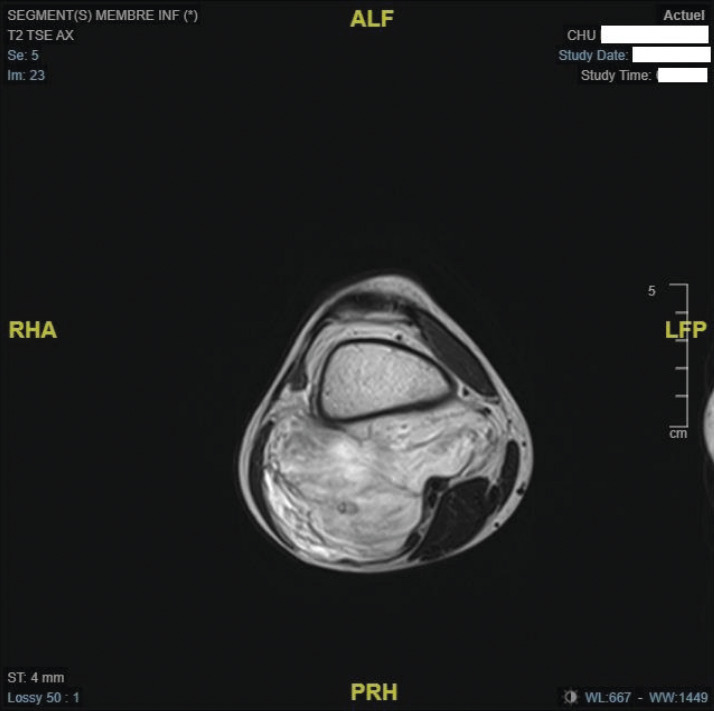 Cliniquement, il existe une masse ferme, indolore, sans signe inflammatoire, mobile par rapport au plan superficiel et localisée à la face postérieure du tiers distal de la cuisse droite. Le reste de l’examen est sans particularités.
