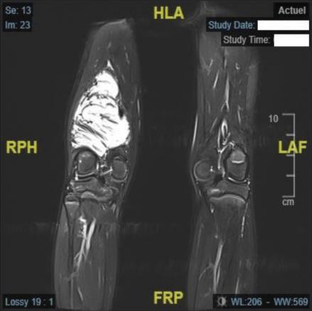 La radiographie montre une volumineuse lésion des parties molles de la région postérieure de la cuisse et du genou droits, à composante mixte partiellement graisseuse.