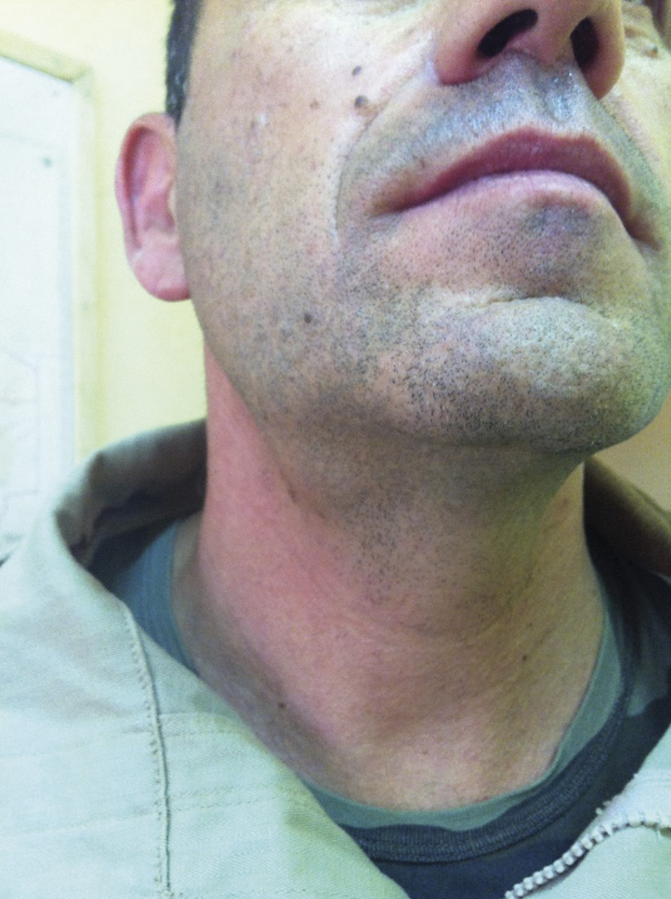 Un patient tabagique de 47 ans consulte pour l’apparition, depuis deux semaines, d’une tuméfaction dure et douloureuse de la région sous-mandibulaire droite (fig. 1 ), sans signe associé. Il précise que les douleurs sont majorées au décours des repas jusqu’à lui imposer une diminution de la prise alimentaire.