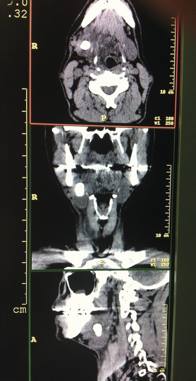 L’examen biologique est normal : absence de syndrome inflammatoire, hémogramme sans anomalie. La tomodensitométrie cervicale (fig. 2 et 3 ) montre une volumineuse formation calcifiée (20 × 15 mm). Cette masse correspond à la glande salivaire sous-mandibulaire droite totalement calcifiée, sans caractéristiques péjoratives.