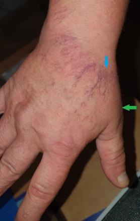 - le syndrome des mains bouffies (flèche verte), conséquence d’un lymphœdème chronique favorisé par une destruction du réseau veinolymphatique, fréquemment observé chez les patients s’injectant différentes drogues de façon répétée ;