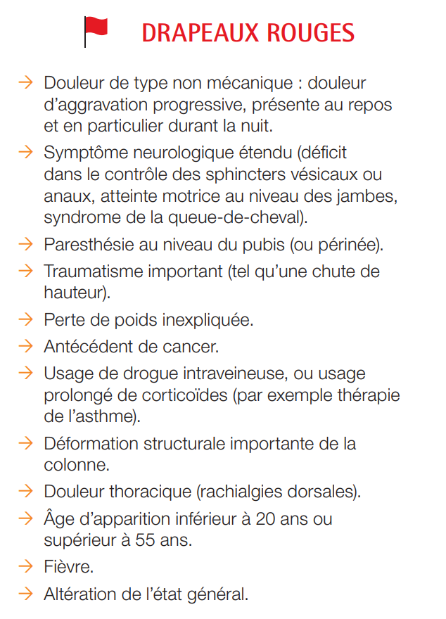 La recherche de tels signes (v. figure ci-contre), qui orientent vers une pathologie sous-jacente nécessitant une prise en charge spécifique et/ou urgente, doit être réalisée pour toute douleur lombaire récente, ou lorsque de nouveaux symptômes apparaissent ou s’aggravent. Isolés, ils sont peu spécifiques : c’est leur combinaison qui doit attirer l’attention et faire suspecter une affection sous-jacente à la douleur lombaire justifiant une prise en charge spécifique.