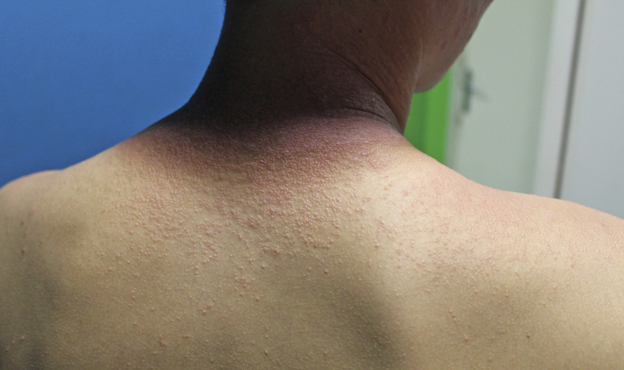 Les symptômes surviennent entre 2 heures et 5 jours après l’exposition :prurit, sensation de cuisson cutanée, parfois frissons et nausées ; les lésions apparaissent ensuite sur les zones photo-exposées (partie supérieure du thorax, mains, avant-bras et bras, jambes et cuisses). Le visage est généralement épargné.