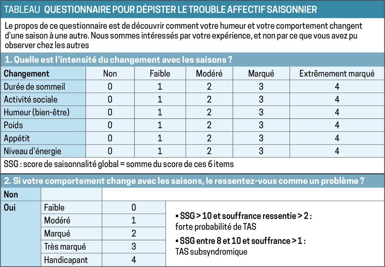 En médecine générale, on peut le dépister avec l’outil SPAQ (Seasonal Pattern Assessment Questionnaire ;tableau ), autoquestionnaire simple et rapide.
