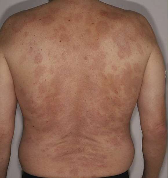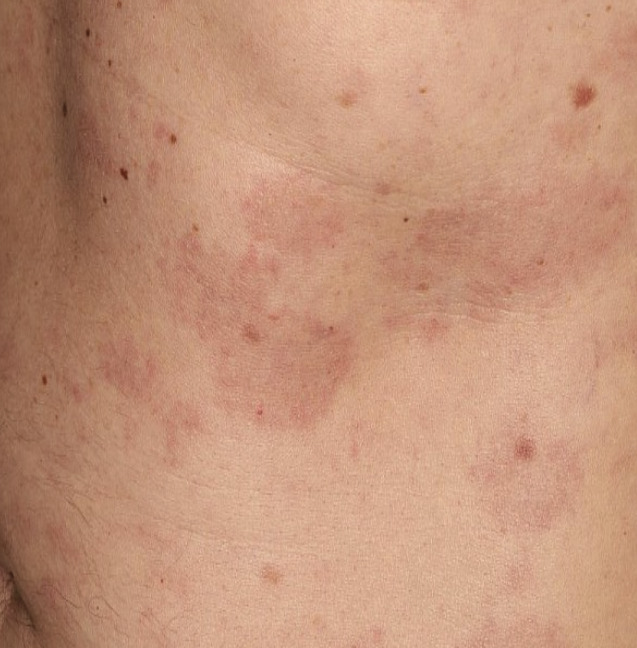 Dans les formes plus diffuses, on peut discuter une toxidermie, mais aussi une éruption paravirale ou une dermatomyosite. Cette dernière est le principal diagnostic différentiel (érythro-œdème des paupières, érythème périunguéal caractéristique, atteinte préférentiellement articulaire avec papules de Gottron).
