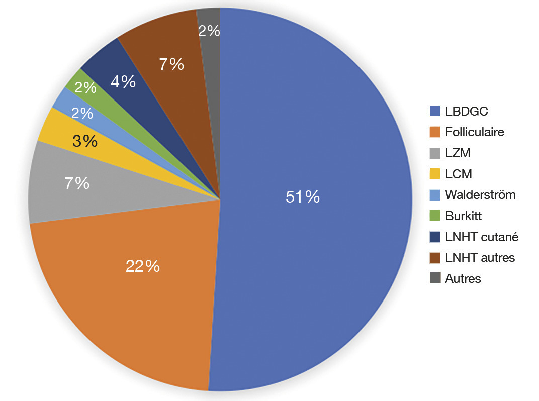 Les LNH agressifs comprennent les LNH B diffus à grandes cellules (LBDGC), le LNH de Burkitt, les lymphomes à cellules du manteau (LCM) et les LNH T.