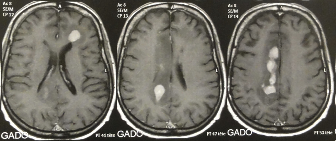 Sur l’IRM, les lésions lymphomateuses prennent le gadolinium et se situent le plus souvent près des ventricules (