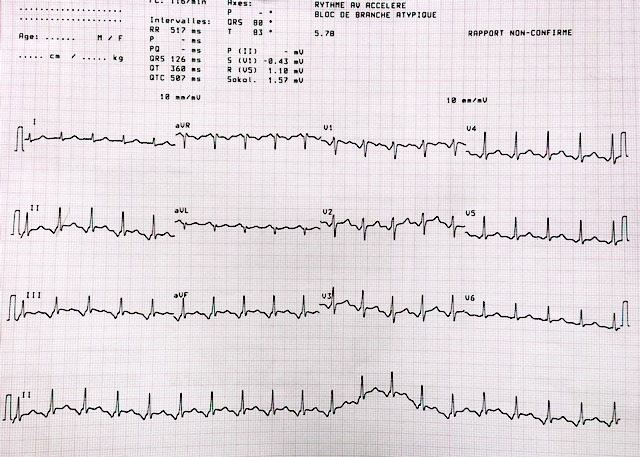 L’ECG est bien évidemment un examen paraclinique indispensable dans ce contexte. En effet, même si le syndrome coronaire aigu paraît peu probable, la triade pilule œstroprogestative, tabac et âge supérieur à 35 ans doit alerter. En outre, la symptomatologie cardiaque est récidivante. La maladie de Coumel est une tachycardie jonctionnelle par réentrée entre le nœud atrioventriculaire (NAV) et une voie accessoire qui ne conduit qu’en rétrograde et de façon lente et décrémentielle (ralentie lorsque la fréquence s’accélère, de la même façon que le NAV). C’est un diagnostic différentiel du syndrome de Wolff-Parkinson-White : dans la tachycardie de Coumel, il n’y a pas de préexcitation, donc pas d’onde delta. Ce trouble du rythme est classiquement congénital et peut persister chez l’adulte. Chez notre patiente, cette voie de conduction rétrograde était déjà visible sur un ECG une dizaine d’années auparavant (visite de médecine du travail). Elle était alors asymptomatique.