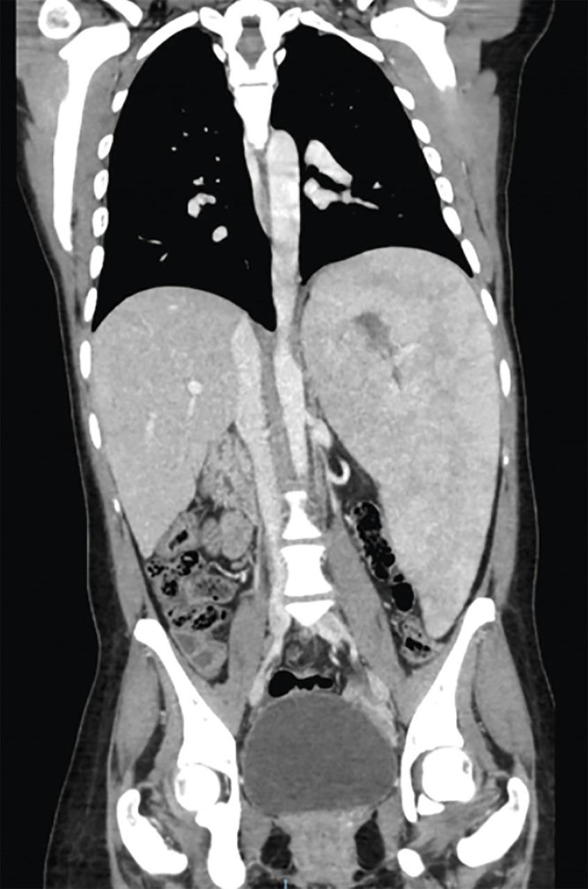 La splénomégalie est l’un des principaux signes cliniques, elle est présente chez plus de 90 % des patients, parfois massive et responsable d’une distension ou de douleurs abdominales. Il peut y avoir un hypersplénisme, participant à la thrombopénie. La splénomégalie peut se compliquer d’infarctus spléniques. Elle est souvent associée à une hépatomégalie, présente dans 60 à 80 % des cas (fig. 2 ). Des lésions focales de la rate ou du foie, appelées « gaucheromes », constituées d’amas de cellules de Gaucher peuvent être notées, pouvant poser le problème du diagnostic différentiel avec le carcinome hépatocellulaire, plus fréquent dans la maladie de Gaucher, ou avec une hémopathie.