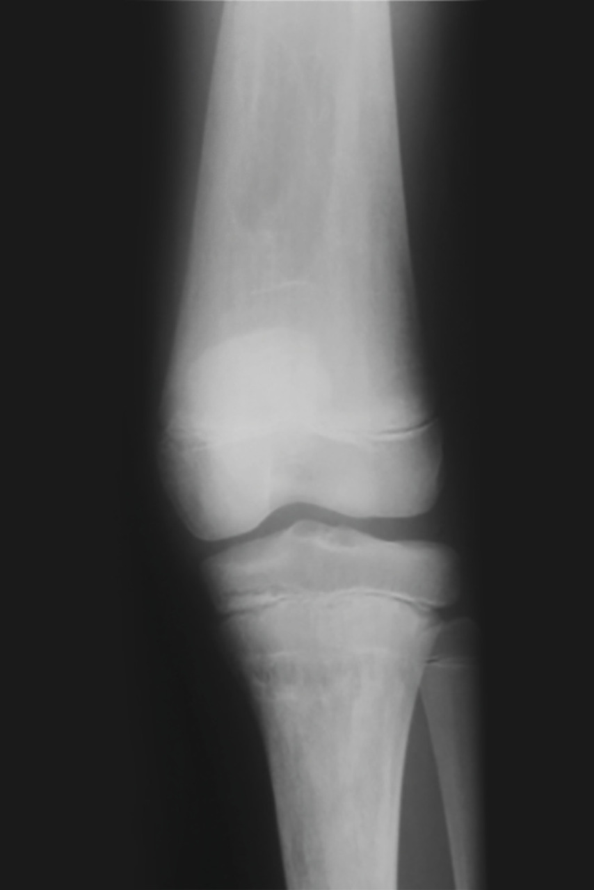 Les infarctus osseux peuvent se manifester par une fièvre modérée associée à un érythème et un œdème, localisés le plus souvent en regard des métaphyses et diaphyses des os longs. L’ostéonécrose aseptique, qui résulte de phénomènes identiques, est localisée aux épiphyses et atteint de manière préférentielle les têtes fémorales, les têtes humérales, et plus rarement les condyles fémoraux, les plateaux tibiaux, ou les corps vertébraux (vertebra plana). Les ostéonécroses épiphysaires peuvent conduire à une arthrose, justifiant à terme la pose d’une prothèse. La déformation des fémurs en flacon d’Erlenmeyer (fig. 3 ) correspond à un élargissement métaphysodiaphysaire des os longs, par défaut de remodelage osseux et de tubulation métaphysaire. Enfin, il existe une réduction de la densité minérale osseuse, avec un risque d’ostéoporose.