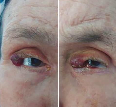 Six mois après le début du traitement, la patiente a développé au niveau des deux yeux des lésions nodulaires violines arrondies indolores, non prurigineuses, augmentant progressivement de taille et de volume, mobiles par rapport aux plans profonds, faisant respectivement 1,5 cm et 1 cm de diamètre (