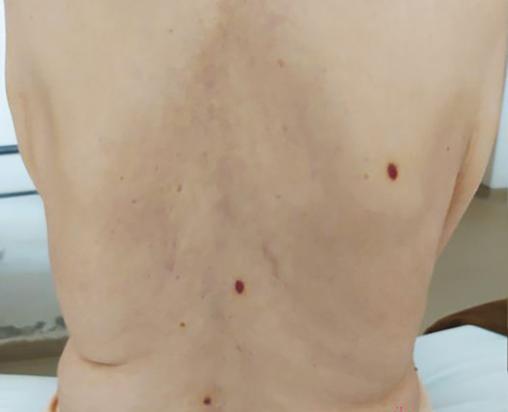 Une patiente âgée de 80 ans est suivie pour une dermatomyosite depuis neuf mois, diagnostic retenu sur des critères cliniques, immunologiques, électromyographiques et radiologiques. Elle a été mise sous corticothérapie orale, avec une bonne évolution.