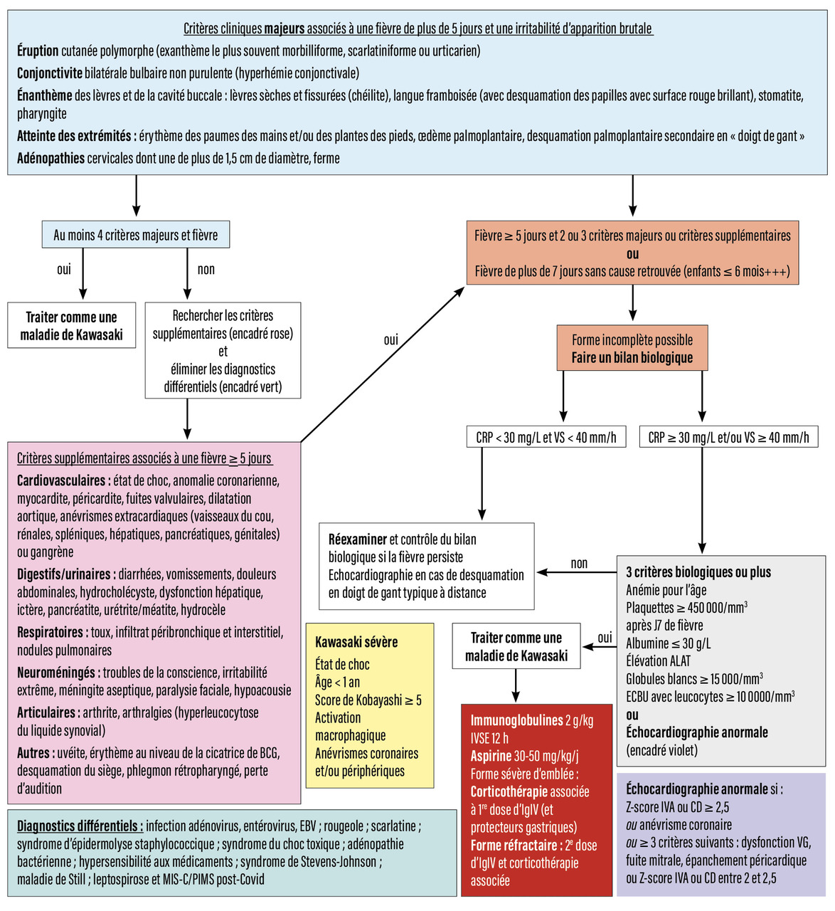 Ainsi, pour les enfants avec fièvre depuis au moins cinq jours et deux ou trois critères majeurs ou supplémentaires ou pour les nourrissons de moins de 6 mois avec fièvre de plus de sept jours sans cause évidente (fig. 2, encadré orange ) et ayant un syndrome inflammatoire biologique, des critères biologiques spécifiques ou échocardiographiques permettent d’argumenter le diagnostic (fig. 2, encadré gris ) ; on parle alors de maladie de Kawasaki « incomplète ».6